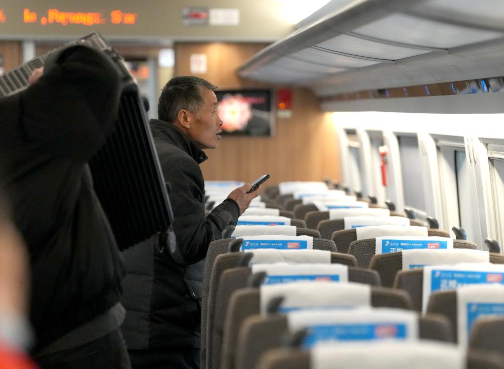 2025年2月14日,在高铁G9263“务工专列”上,乘客在对照电子车票信息寻找座位。新华社记者 郭晨 摄