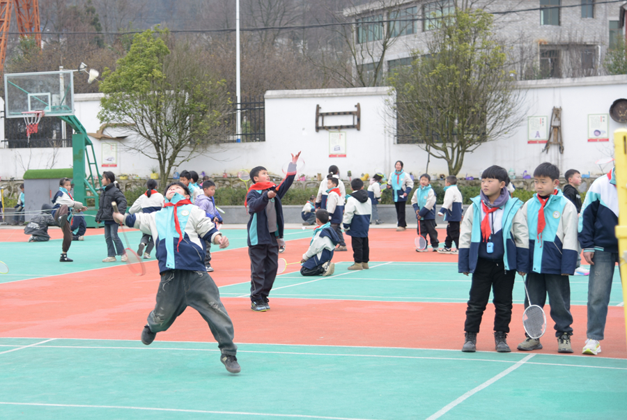 跳竹竿舞、打羽毛球、丢沙包、转呼啦圈、滚铁环、打乒乓球、跳绳……放眼望去,孩子们分散在校园的各个角落,玩得不亦乐乎,欢笑声在校园里回荡。