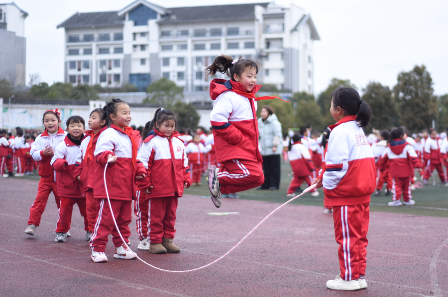 2025年2月25日,贵阳市花溪区青岩小学的学生在大课间跳长绳。新华社记者 郑明鸿 摄