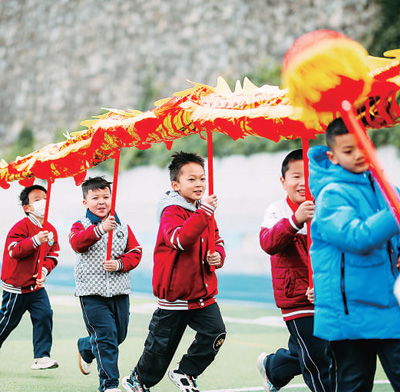 贵州贵阳云岩区人贵实验小学学生在课间体验舞龙。贵阳云岩区委宣传部供图