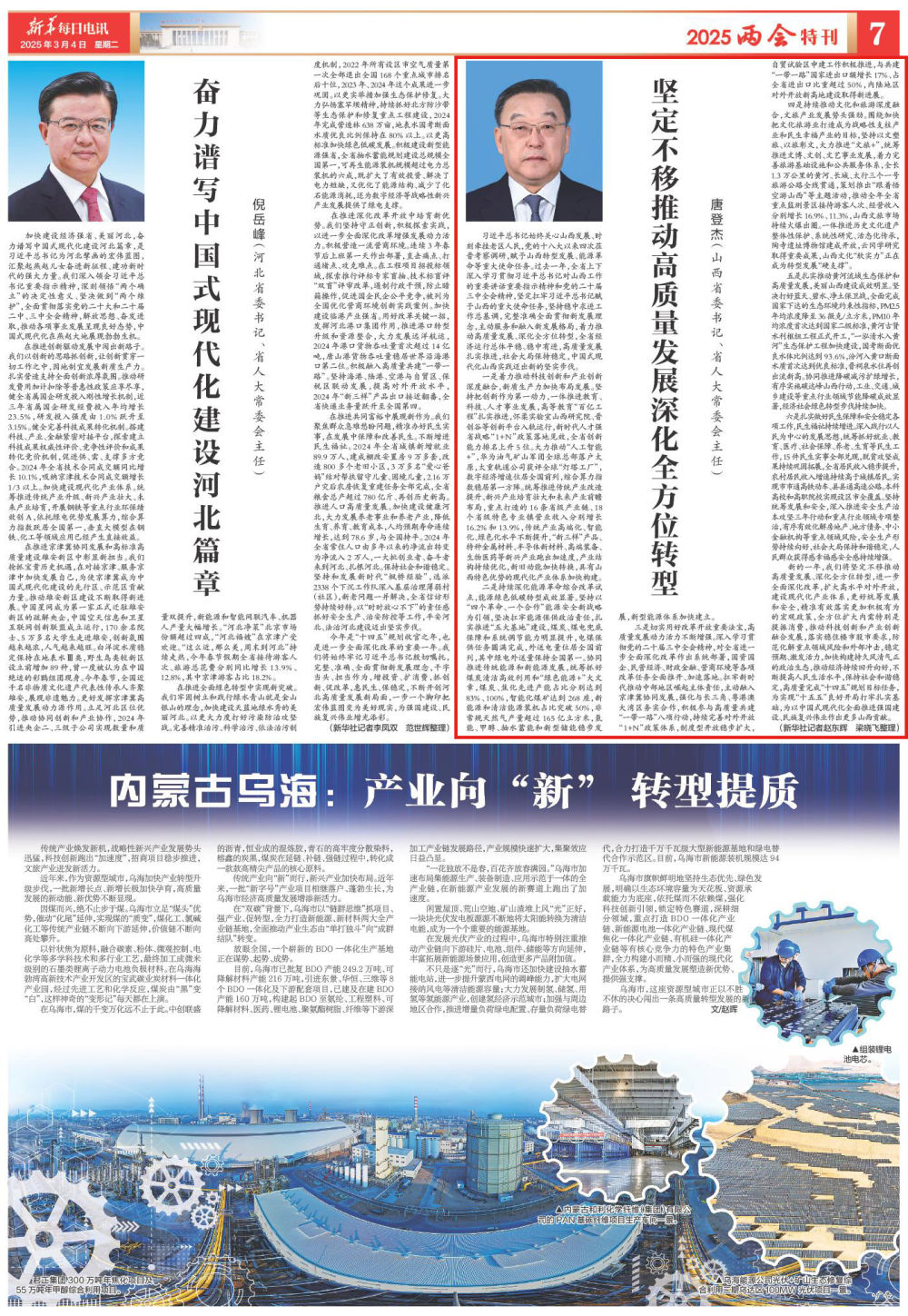 二是持续深化能源革命综合改革试点,能源绿色低碳转型成效显著。坚持以“四个革命、一个合作”能源安全新战略为引领,坚决扛牢能源保供政治责任,扎实推进“五大基地”建设,煤炭、煤电兜底保障和系统调节能力明显提升,电煤保供任务圆满完成,外送电量位居全国前列,其中绿电外送量保持全国第一。协同推进传统能源和新能源发展,统筹抓好煤炭清洁高效利用和“绿色能源+”大文章,煤炭、焦化先进产能占比分别达到83%、100%,智能化煤矿达到268座,新能源和清洁能源装机占比突破50%,非常规天然气产量超过165亿立方米,氢能、甲醇、抽水蓄能和新型储能稳步发展,新型能源体系加快建立。