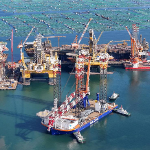 2024年10月16日,中集来福士山东烟台建造基地,多型海工装备和特种船舶在进行建造和测试(无人机照片)。新华社发(唐克摄)