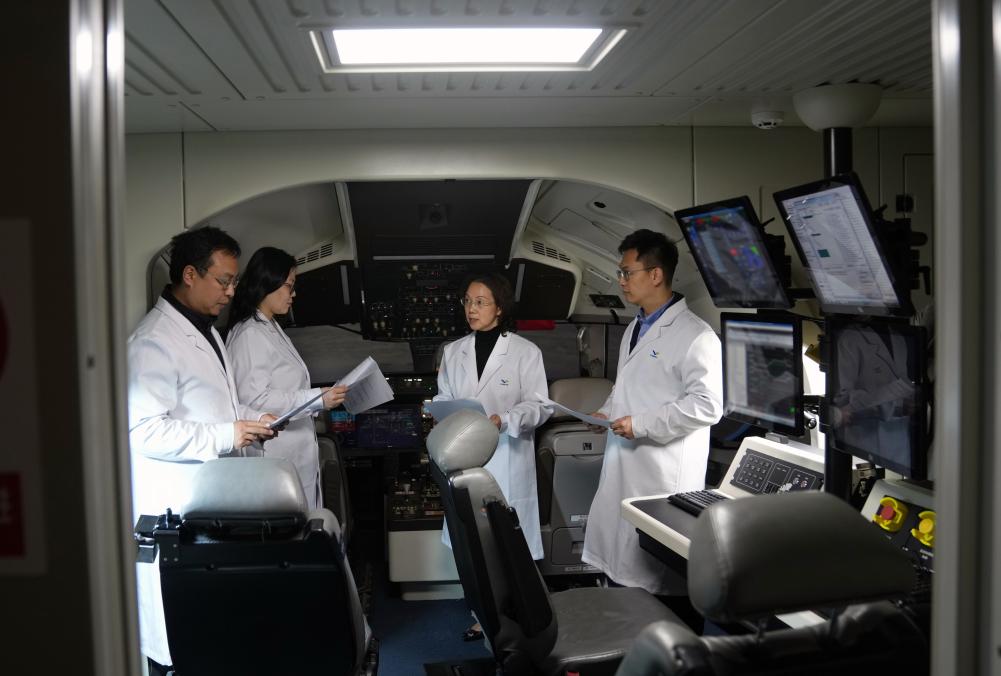 3月5日,赵春玲(右二)与团队成员在C919工程模拟器内工作。新华社记者 刘颖 摄