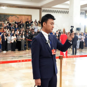 3月7日,海尼扎提·托呼提在北京人民大会堂内拍摄短视频。
