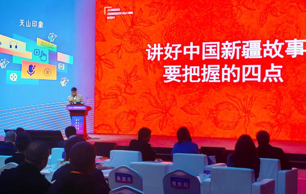 海尼扎提·托呼提在首届新疆网络视听大会上发言(2024年10月17日摄)。