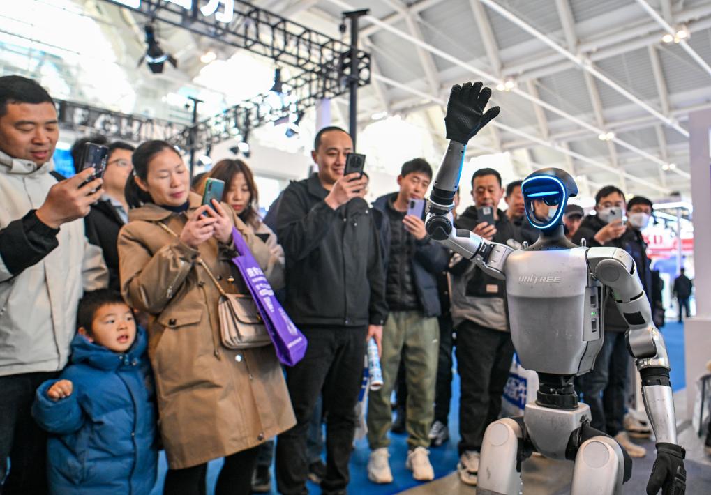2025年3月6日,第21届中国(天津)国际装备制造业博览会在国家会展中心(天津)开幕。图为宇树科技带来的一款人形机器人。新华社记者 孙凡越 摄