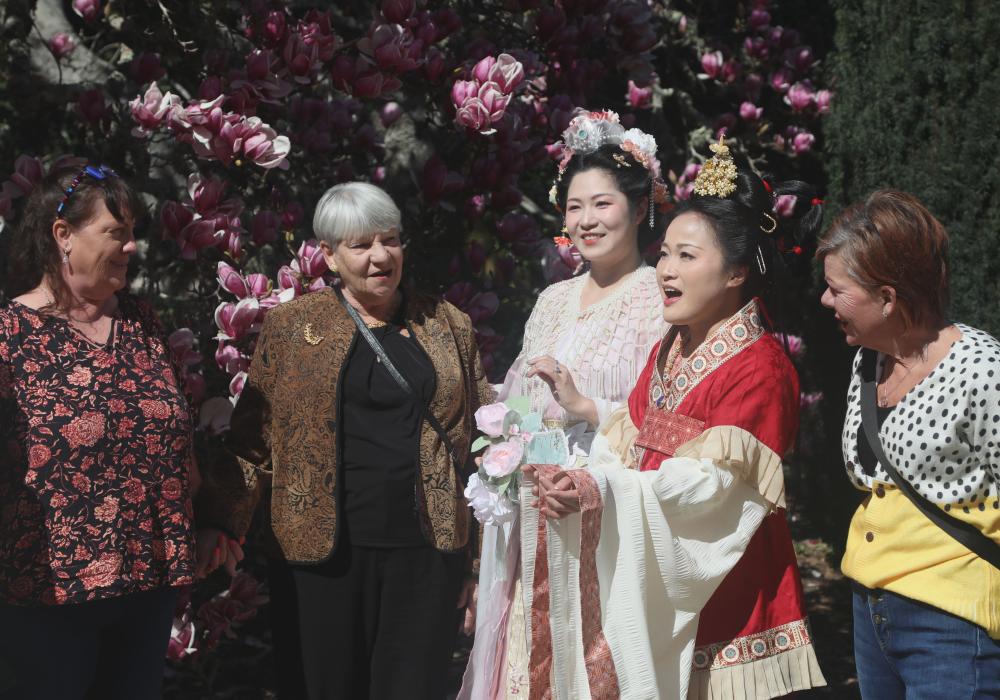 2025年3月1日,在美国伍德赛德的斐洛里庄园,汉服爱好者与游客在花朝节庆祝活动上交流。新华社发 刘艺霖 摄