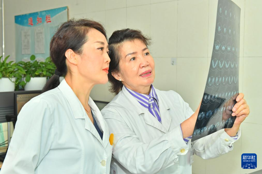 新疆维吾尔自治区人民医院资深专家、主任医师、教授、博士生导师玛依努尔·尼牙孜(右)。新华社发(资料照片)