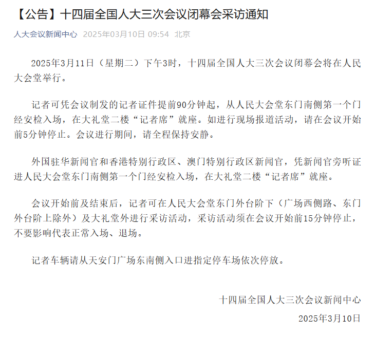 2025年3月11日(星期二)下午3时,十四届全国人大三次会议闭幕会将在人民大会堂举行。