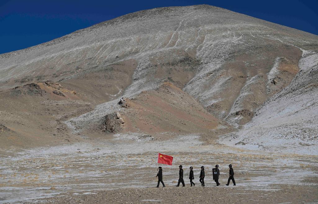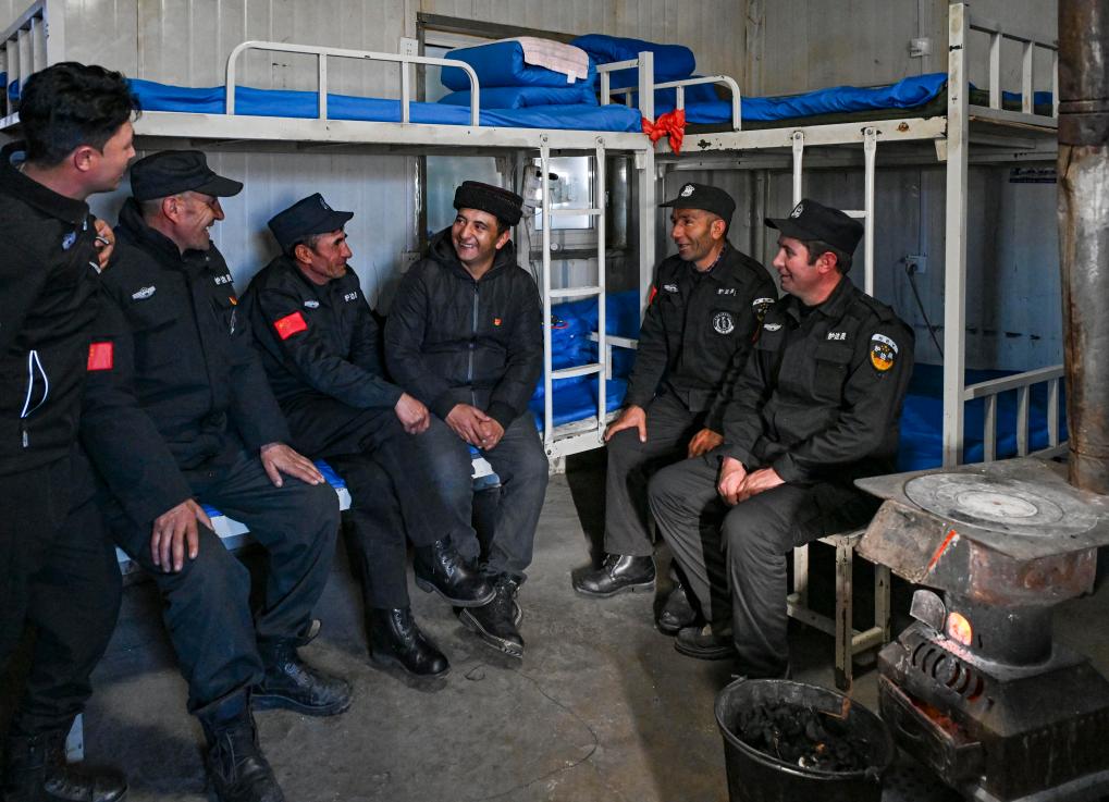 在中国-塔吉克斯坦边境地区的一处执勤点,多来提曼·开米克(右三)同本村护边员交流(2025年1月9日摄)。新华社记者 陈朔 摄
