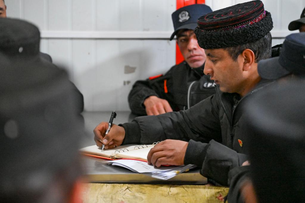 在中国-塔吉克斯坦边境地区的一处执勤点,多来提曼·开米克(右)与护边员交流时记录护边员的反馈(2025年1月9日摄)。新华社记者 陈朔 摄