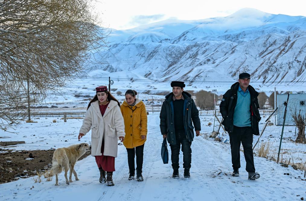 在新疆喀什地区塔什库尔干塔吉克自治县瓦恰乡夏布孜喀拉村,多来提曼·开米克(右二)在村里走访(2025年1月3日摄)。新华社记者 陈朔 摄