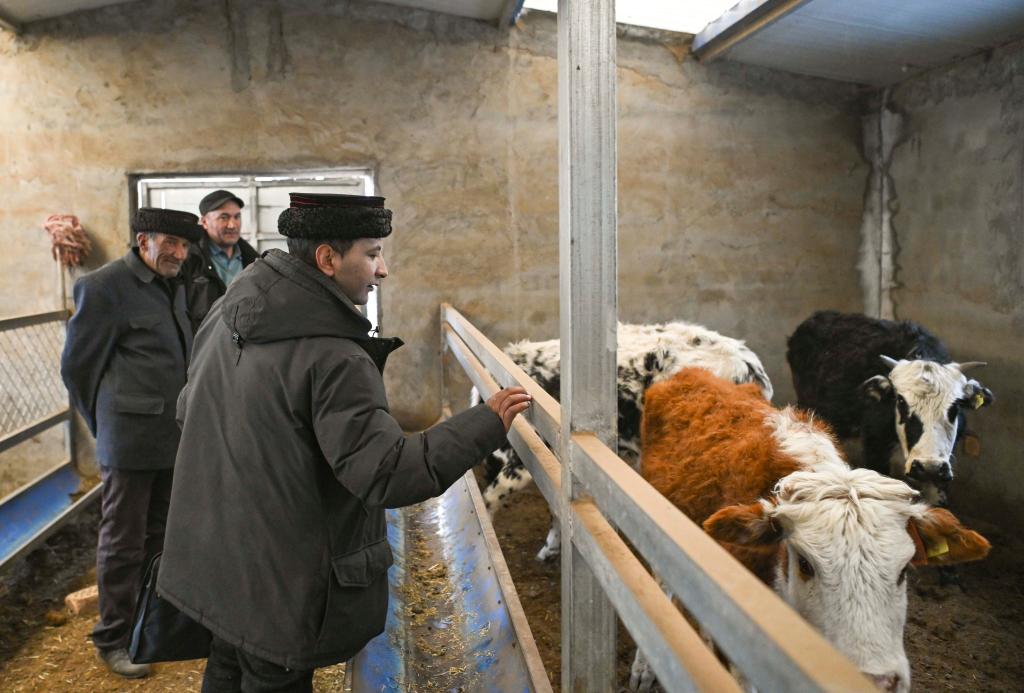 在新疆喀什地区塔什库尔干塔吉克自治县瓦恰乡夏布孜喀拉村,多来提曼·开米克在一户村民的棚圈中实地了解牲畜越冬情况(2025年1月3日摄)。新华社记者 胡虎虎 摄