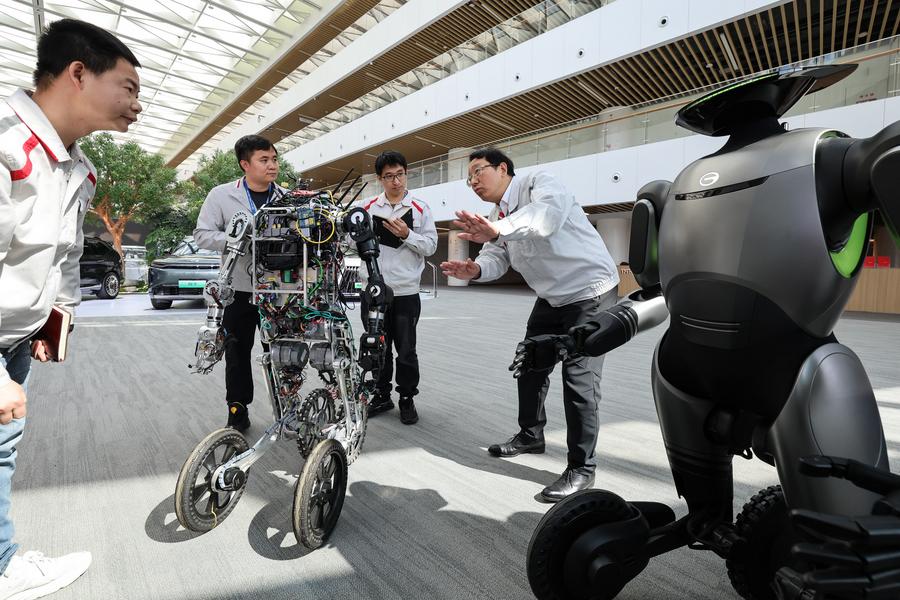 2025年2月24日,全国人大代表冯兴亚(右一)在广州向广汽第三代具身智能人形机器人团队工程师了解该型机器人的AI自主控制技术突破和应用场景创新情况。新华社记者 刘大伟 摄
