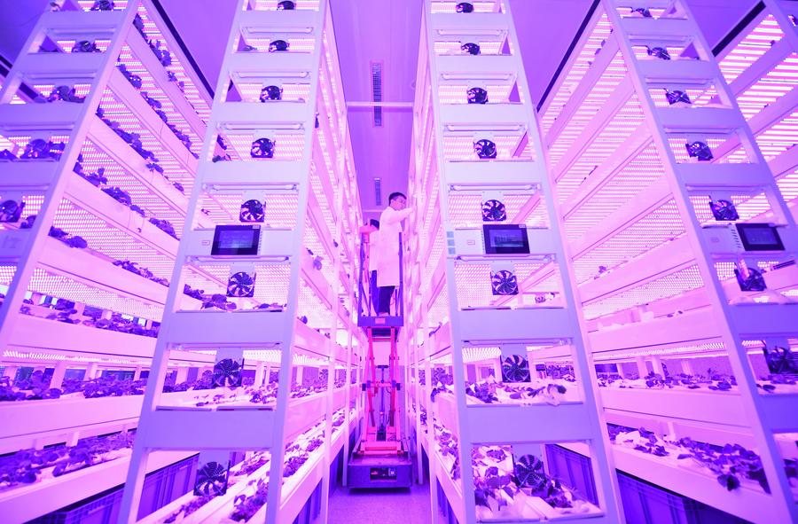 科技人员在中国农业科学院都市农业研究所智能植物工厂观察农作物生长情况(2024年10月16日摄)。新华社记者 刘坤 摄