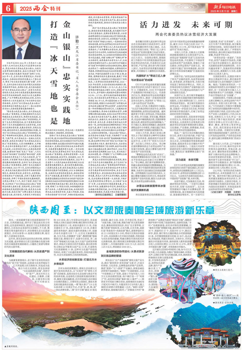 践行“冰天雪地也是金山银山”的重要理念,推动冰雪经济蓬勃发展。我们遵照习近平总书记重要指示,发挥冰雪资源优势,以冰雪旅游带动特色文化旅游全域全季可持续发展,推动冰雪运动、冰雪文化、冰雪装备产业发展,促进“冰雪热”传遍大江南北。一是推动冰雪运动加速发展。我们认真贯彻总书记在申办北京冬奥会时作出的“带动三亿人参与冰雪运动”重要指示,广泛开展群众冰雪运动,在高校增设冰雪艺术专业学科,与国家体育总局共建国家冰雪运动学院,与上合组织共同推进冰雪体育示范区建设,开展“冰雕大师”“雪雕大师”职业头衔评定,培养高层次冰雪专业人才,打造冰雪体育国际交流中心。哈尔滨作为中国著名的“冰城”和中国现代冰雪运动的发源地,圆满成功举办了一届筹办时间最短、比赛场馆利旧率最高、参赛国家和地区及运动员数量最多的亚冬会,中国代表团获得32金27银26铜,金牌数、奖牌数均创历史最好成绩,展现了中国冰雪运动水平,为备战米兰冬奥会进行了实战练兵。二是带动冰雪旅游持续升温。2024—2025年冰雪季,全省冰雪旅游全域持续火爆,累计接待国内外游客1.35亿人次,在上个冰雪季高位增长基础上增长18.5%,游客花费增长30.7%,其中国际入境游客和花费分别增长103.9%、117.5%。漠河北极村接待游客增长55.3%。哈尔滨冰雪大世界开园68天、累计接待游客356万人次,单日最高突破10万人次、创历史新高,闭园次日启动运营了世界最大的室内冰雪主题乐园“梦幻冰雪馆”,让国内外游客一年四季都能欣赏冰雪艺术。三是展现冰雪文化独特魅力。举办哈尔滨国际冰雪节、冰雕雪雕比赛和破冰捕鱼、松花江采冰节等多种活动,推出系列冰雪文创产品,展现了东北地区的民俗文化、渔猎文化。哈尔滨冰雪大世界将冰雪元素、亚冬元素、非遗和多国多地文化等融为一体,亚洲各国地标冰雕景观彰显了开放包容气度,提升了冰雪文化价值,促进了国际文化交流传播。四是加快发展壮大冰雪装备产业。全面优化营商环境,一批企业落户黑龙江,波司登在哈尔滨投产运营,可抵御零下50摄氏度严寒的“尔滨·波司登”高端鹅绒服市场热销,著名品牌齐齐哈尔的“黑龙”冰刀突破了钛合金速滑冰刀技术、填补国内空白,为冰雪运动和国际赛事提供了有力保障,绥芬河冰雪装备出口基地建成运营。据初步统计,2024年全省冰雪经济总规模超2660亿元,有力促进了就业和消费,进一步增强了广大干部群众全面振兴的自信心、干事创业的自豪感。