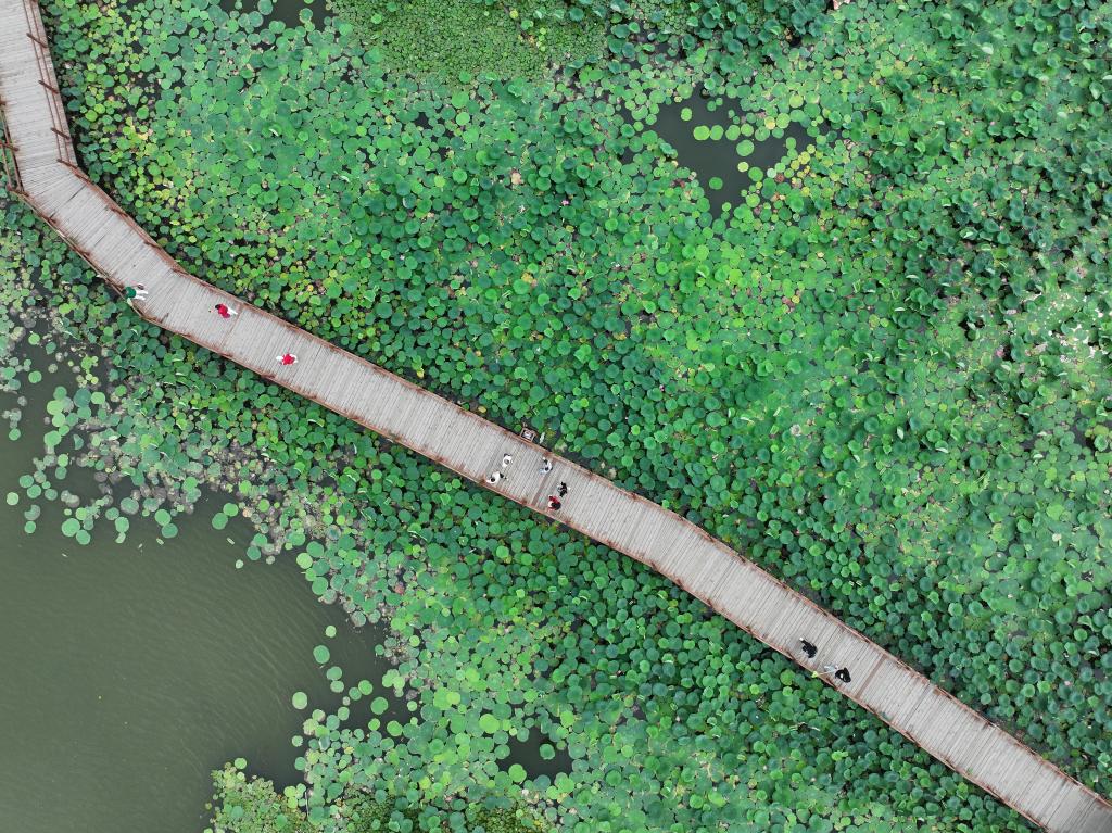 游人在雄安新区白洋淀荷花大观园内游览(2024年7月9日摄,无人机照片)。新华社记者 牟宇 摄