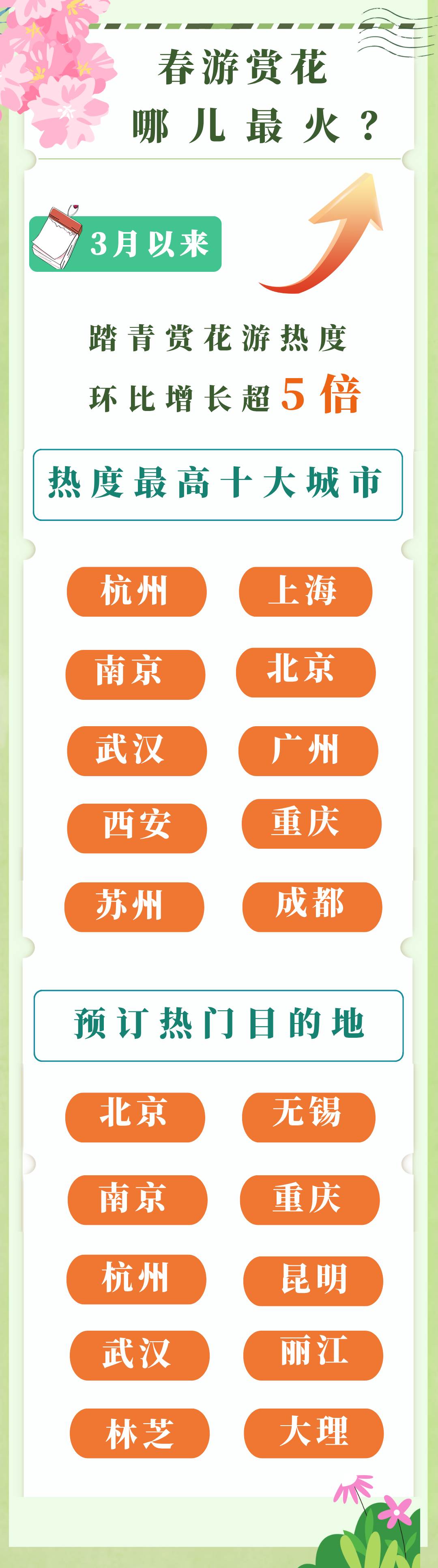数据显示,“追花”之旅在春季再度成为老少皆宜的周末游选项。近期,带有“赏花踏青”标签的景区门票预订量环比增长35%,南方一些鲜花盛放的景区迎来“踏春大军”。