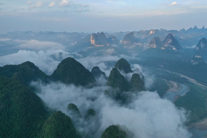 3月,春分时节,南风带来潮湿的水汽,白雾升腾,飘浮于峰林之间,形成一年中最独特的景观——“烟雨桂林”。