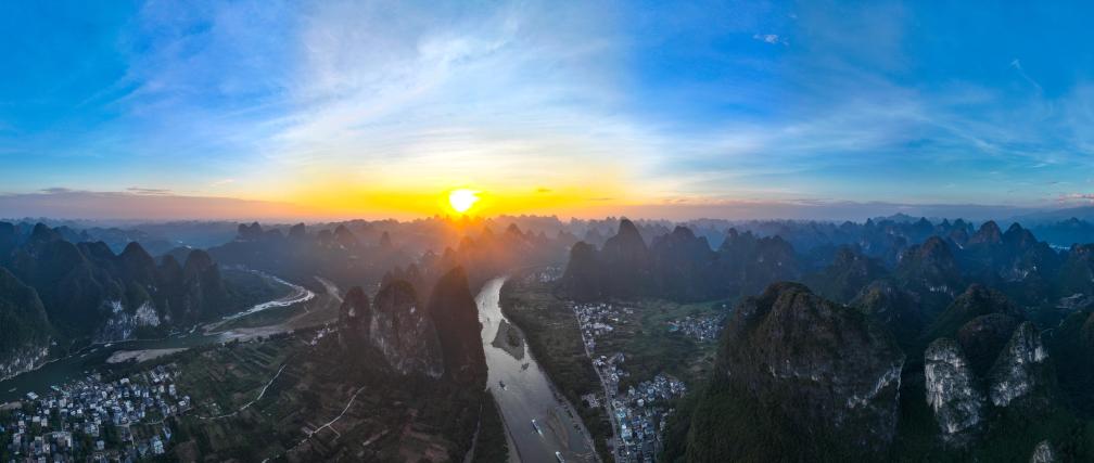 2024年10月26日在广西桂林市阳朔县兴坪镇拍摄的漓江日落景观(无人机照片)。新华社发(黄勇丹 摄)