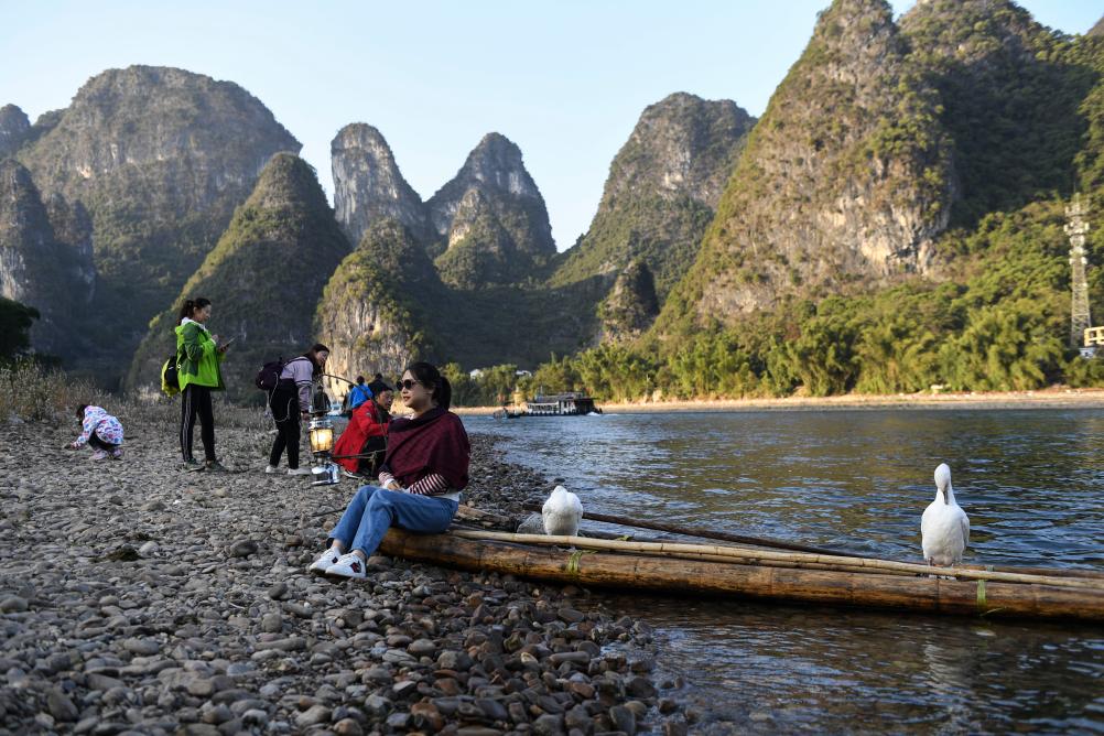 2019年11月19日,游客在广西桂林市阳朔县兴坪古镇游览。新华社记者 曹祎铭 摄要拍深水抱石