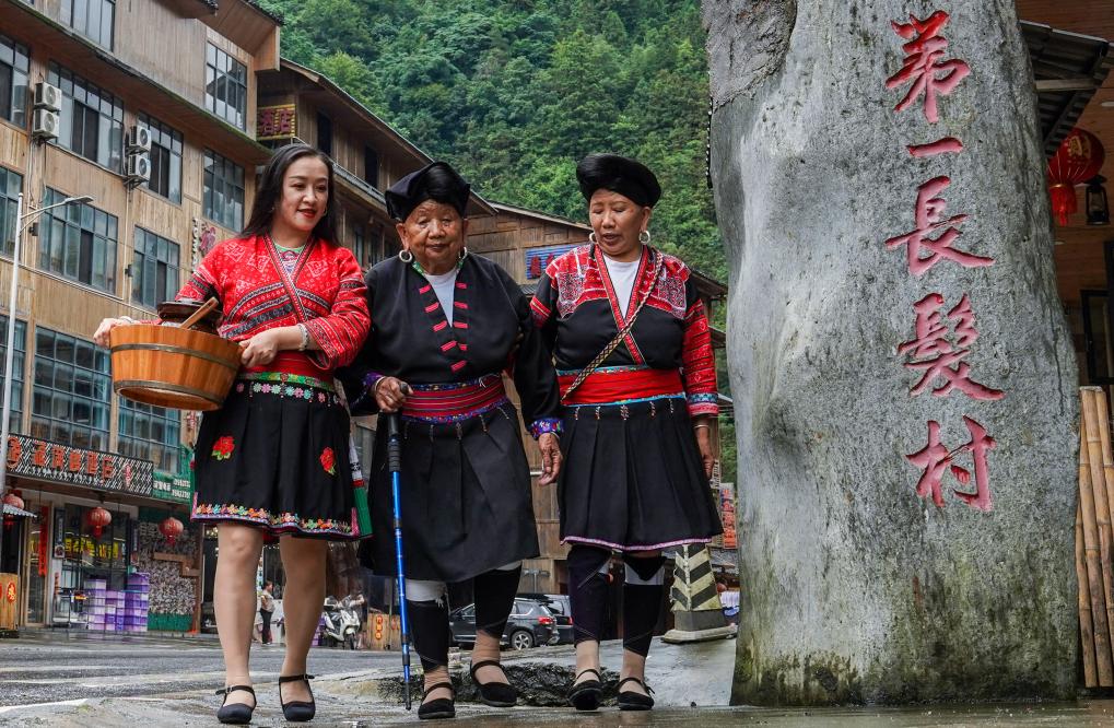 2024年6月26日,在广西桂林市龙胜各族自治县龙脊镇,三位瑶族妇女在瑶寨内行走。新华社记者 张爱林 摄