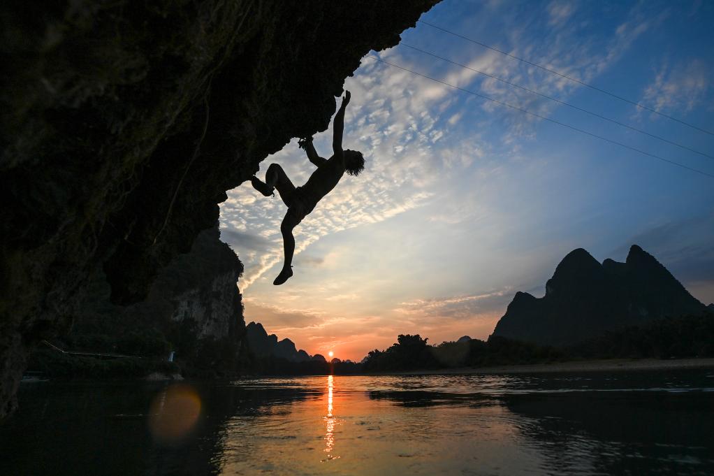 2022年9月7日,攀岩爱好者在广西桂林市阳朔县进行深水抱石。新华社记者 曹祎铭 摄要拍黄洛瑶寨