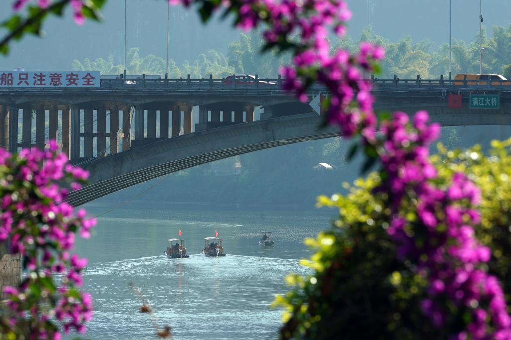 2024年10月25日,在广西桂林市阳朔县城漓江大桥,游客乘坐竹筏游览漓江。新华社记者 马宁 摄