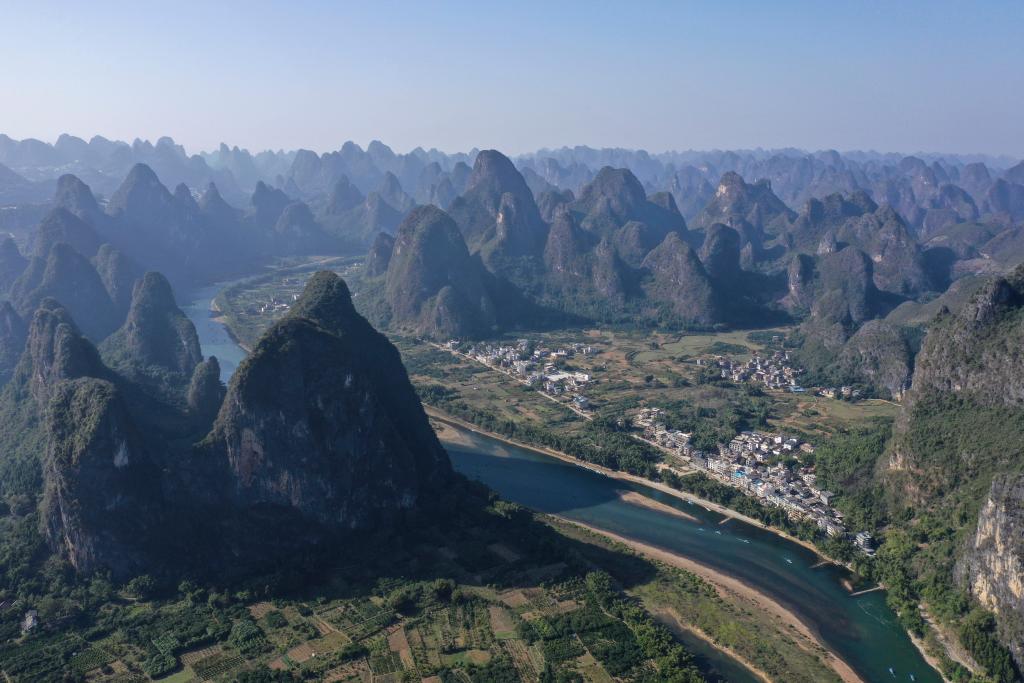 2019年11月19日,在桂林市阳朔县兴坪古镇拍摄的漓江两岸山水美景(无人机照片)。新华社记者 曹祎铭 摄