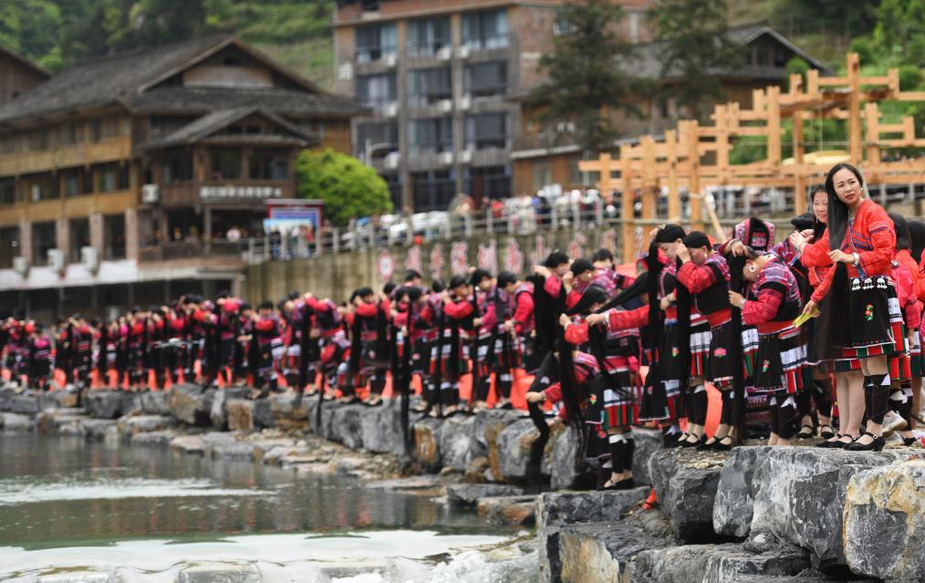 2024年4月11日,在广西桂林市龙胜各族自治县黄洛瑶寨,瑶族妇女在河边梳洗长发。新华社发(潘志祥 摄)要拍晒衣节