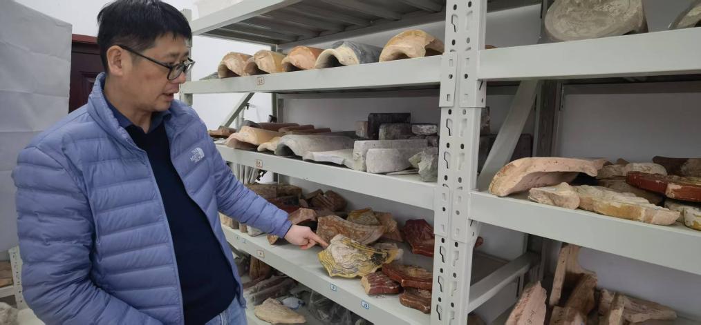 王志在明中都考古工作站向记者介绍考古出土遗物。新华社记者 白斌 摄