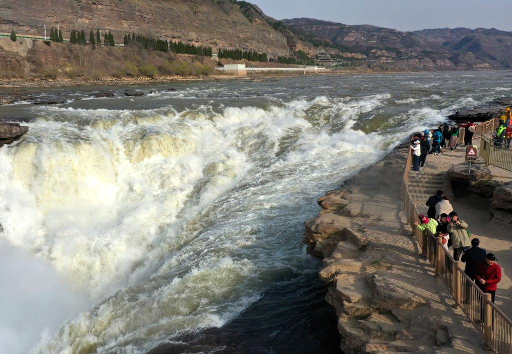 站在壶口瀑布岸边,只见两岸山桃花盛开,与飞流直下的瀑布相互映衬。来自山西太原的游客徐楠说:“我们本来想看壶口瀑布一年一度的‘桃花汛’,结果来了之后发现已经结束了,不过能看到壶口瀑布的‘清流飞瀑’美景也算不虚此行。”(记者王飞航)
