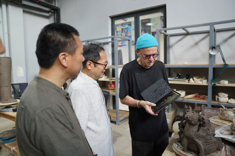 一名来自瑞典的陶瓷艺术家(右一)在景德镇与中国同行交流互动(2023年4月20日摄)。新华社记者 周密 摄