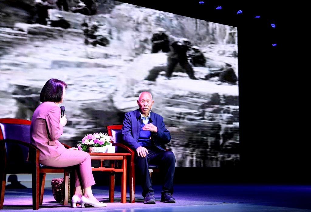 张买江(右)在红旗渠干部学院向学员讲述当年修渠的情景(2025年3月26日摄)。新华社记者 郝源 摄