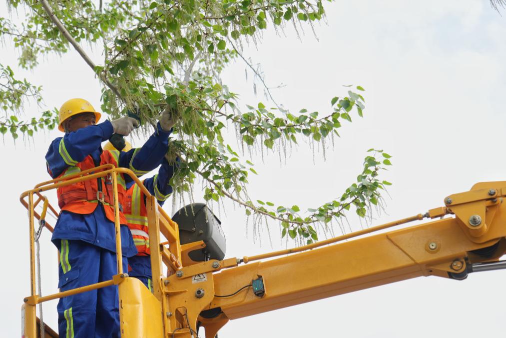 9日上午,在北京永定门东滨河路旁,一辆园林绿化工作车停到几棵杨树边,车斗载着工作人员缓缓升起,将交错、过密的枝条一一剪下;另一组工作人员则操控喷雾设备,将凝絮剂均匀喷洒在杨树上,以减少杨絮飘散。