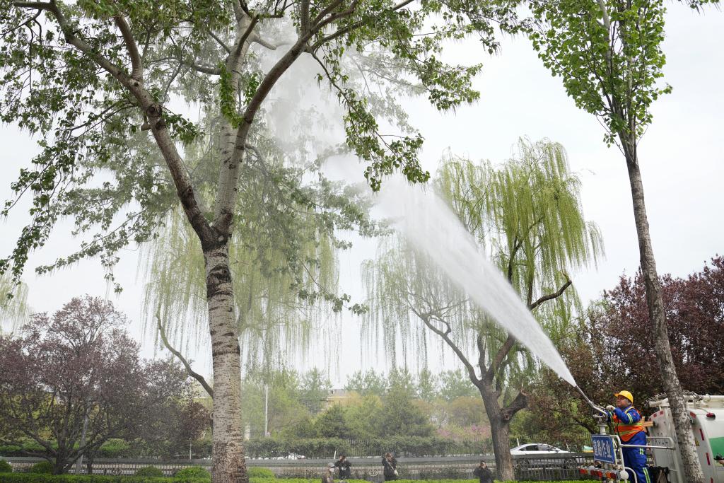 4月9日,北京的园林工作人员进行喷水作业。新华社记者 鞠焕宗 摄