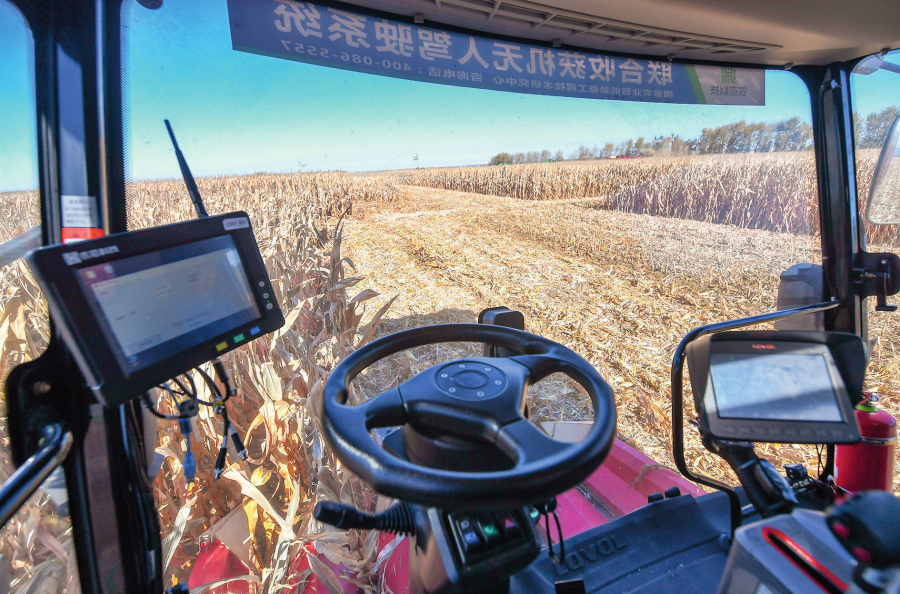 在中国科学院“黑土粮仓”科技会战长春示范区公主岭示范基地,无人驾驶农机在收获玉米(2023年10月19日摄)。 张楠摄/本刊