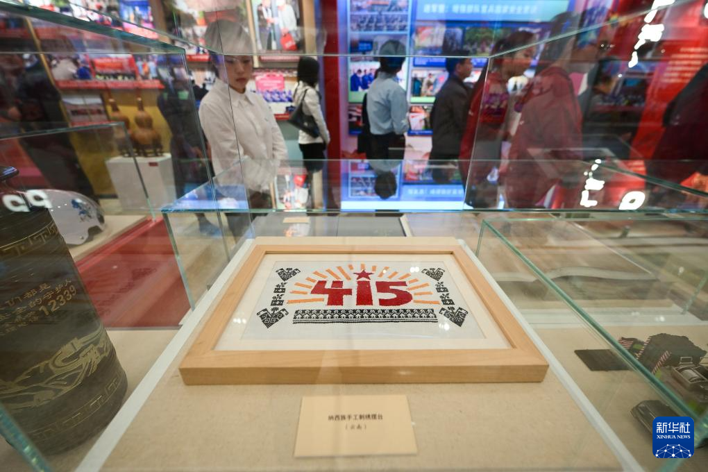 这是展览上展示的纳西族手工刺绣摆台(4月15日摄)。新华社记者 李鑫 摄