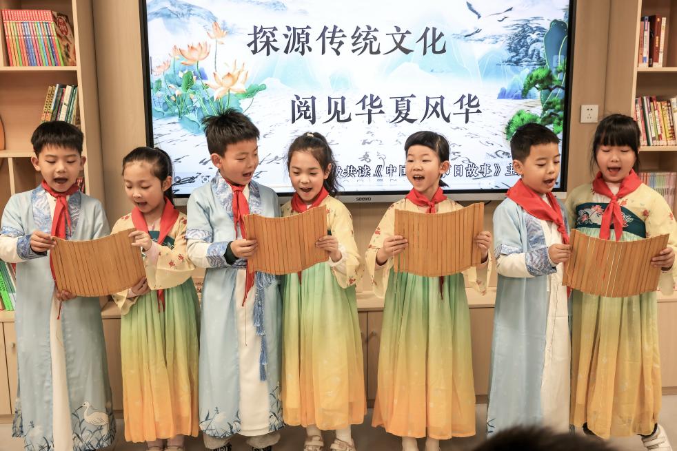 4月2日,湖北省武汉市洪山区未来实验小学美林校区学生在吟诵古诗。新华社发(赵军摄)