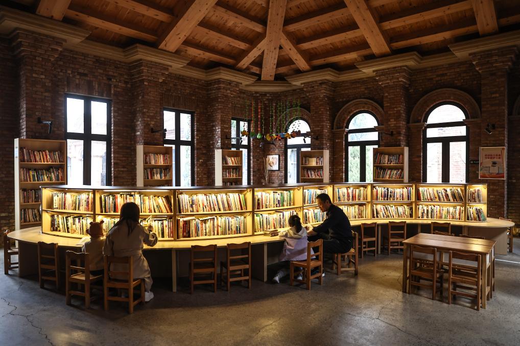 4月17日,小朋友在家长的陪同下在沈阳市铁西区奉天工场文创园内的城市书房内读书。新华社记者 潘昱龙 摄