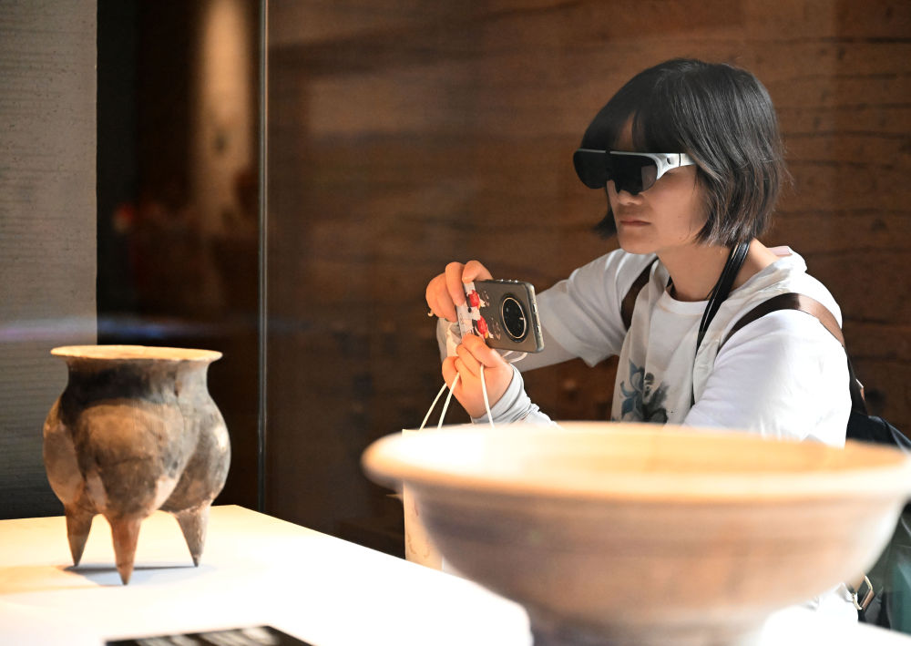 2025年4月16日,游客佩戴智能眼镜在位于河南省洛阳市偃师区的二里头夏都遗址博物馆参观。新华社记者 李嘉南 摄