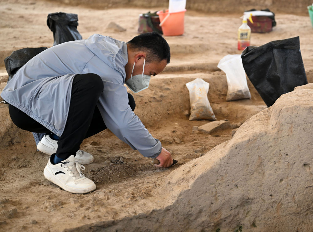 2025年4月16日,工作人员在位于河南省洛阳市偃师区的二里头遗址发掘现场作业。新华社记者 李嘉南 摄