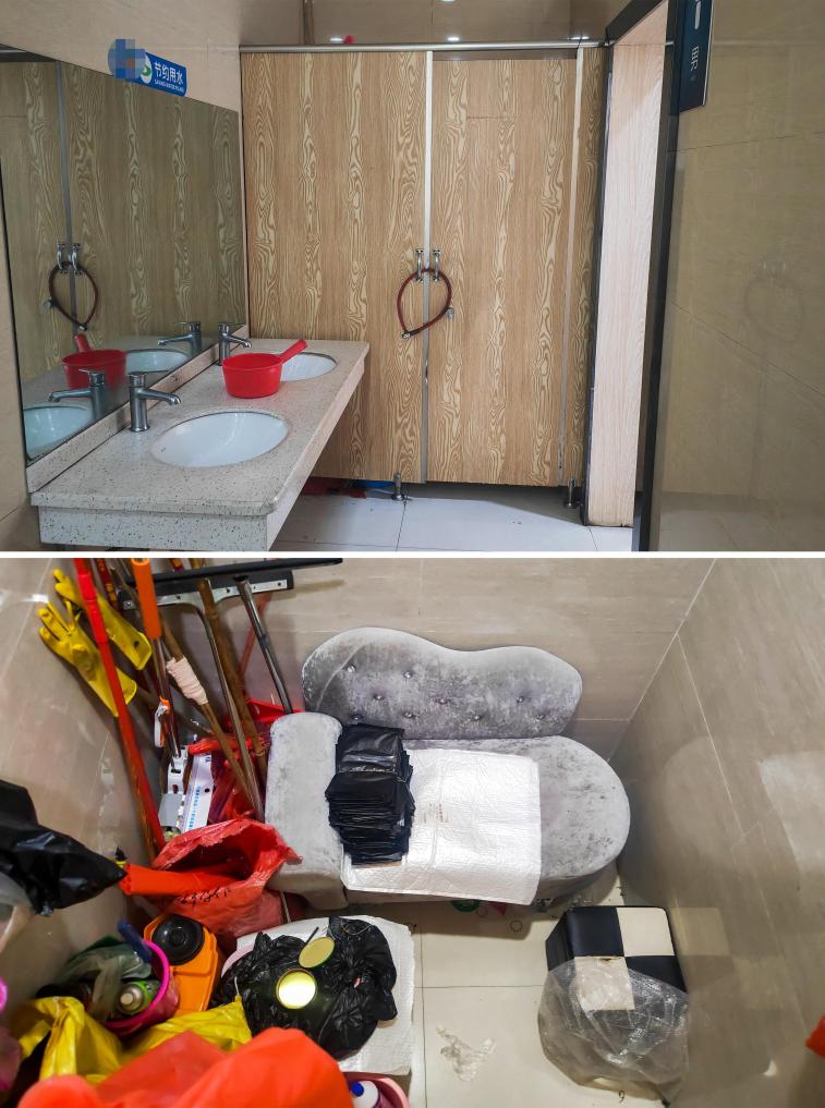 在广西某市一家商场内,卫生间里的一个小隔间既是保洁工具间,又是保洁人员休息室(4月17日摄)。