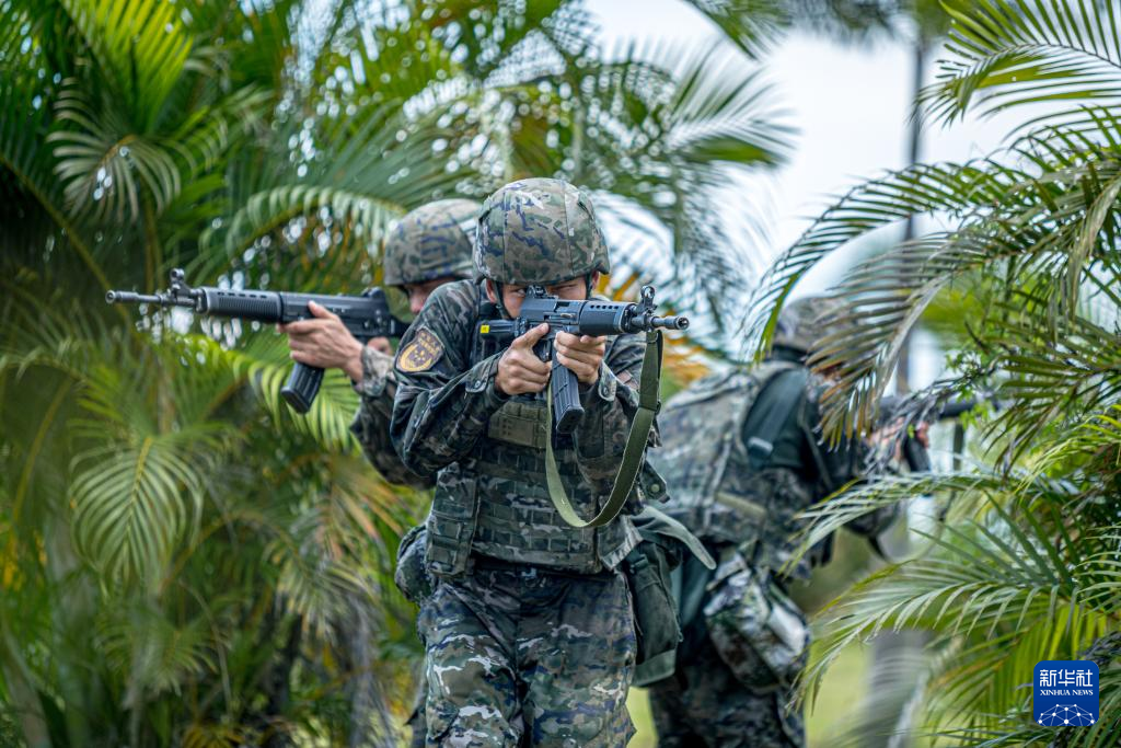 武警广东总队珠海支队执勤一中队官兵进行战术协同搜索(2024年7月10日摄)。新华社发(刘佳良 摄)