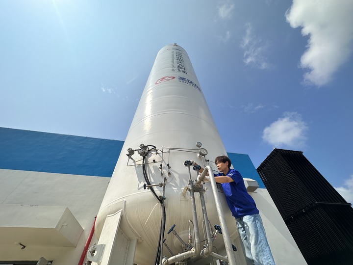 陈恩伟在海南商业航天发射场技术区罐区进行液氮转注前准备。新华社记者 陈凯姿 摄