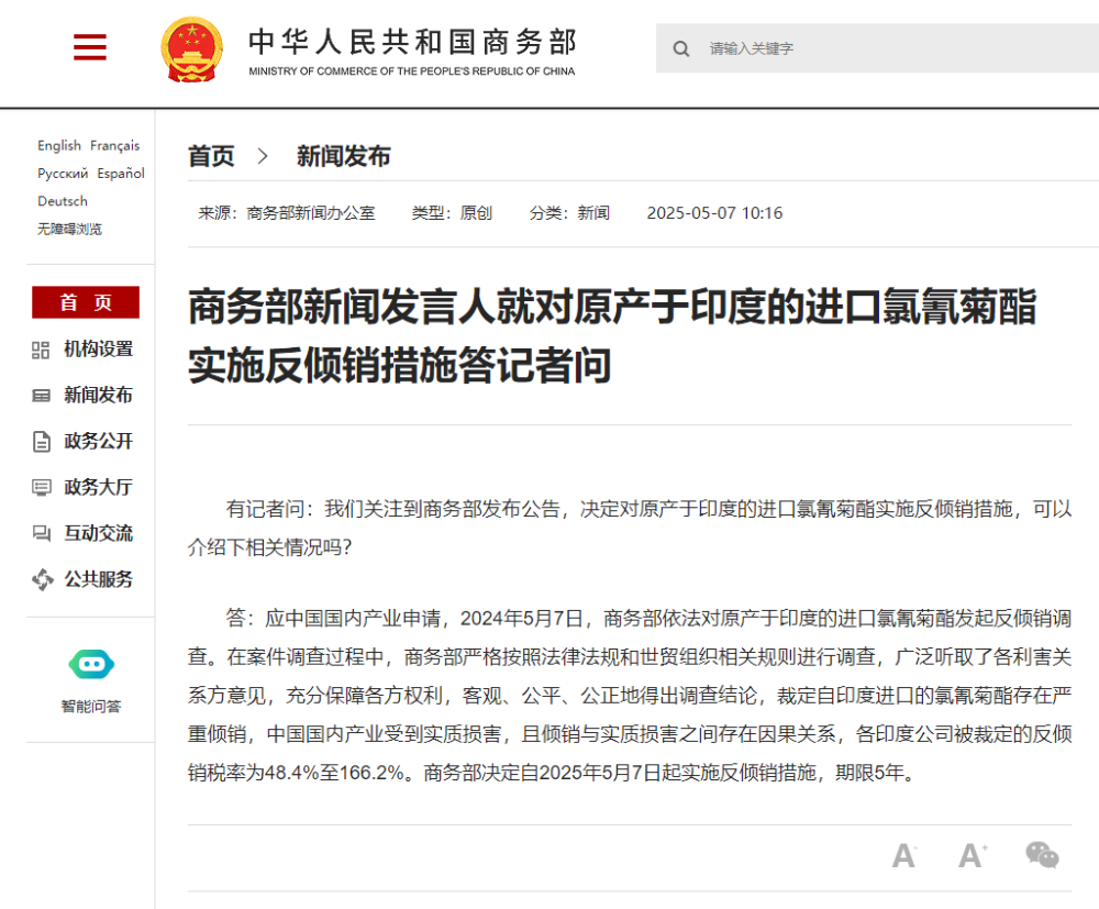 答:应中国国内产业申请,2024年5月7日,商务部依法对原产于印度的进口氯氰菊酯发起反倾销调查。在案件调查过程中,商务部严格按照法律法规和世贸组织相关规则进行调查,广泛听取了各利害关系方意见,充分保障各方权利,客观、公平、公正地得出调查结论,裁定自印度进口的氯氰菊酯存在严重倾销,中国国内产业受到实质损害,且倾销与实质损害之间存在因果关系,各印度公司被裁定的反倾销税率为48.4%至166.2%。商务部决定自2025年5月7日起实施反倾销措施,期限5年。