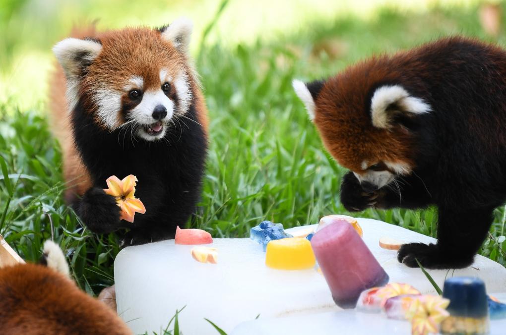 2023年7月13日,广州动物园里的小熊猫享用冰镇水果。新华社记者 邓华 摄