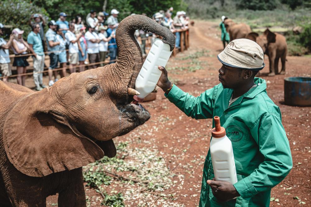 2024年10月16日,看护人在位于肯尼亚首都内罗毕市郊的大象孤儿院内喂养小象。新华社记者 王冠森 摄