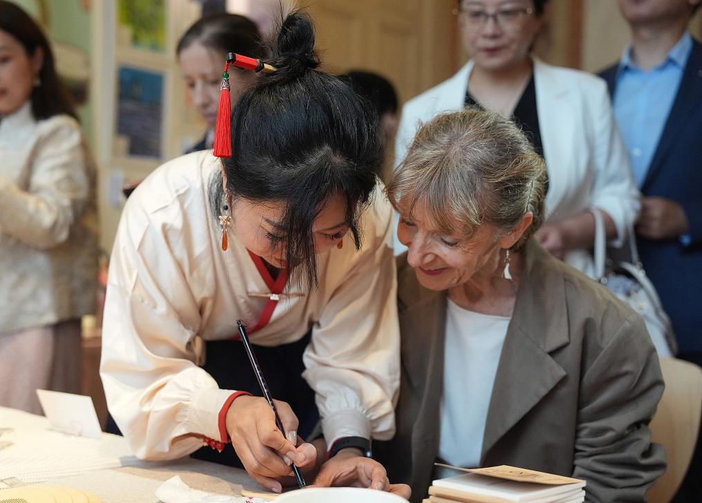 2024年9月3日,“美丽工坊 绽放巴黎”残疾妇女文创作品展在法国巴黎中国文化中心开展,一名观众体验彩绘木梳。新华社记者侯昭康 摄