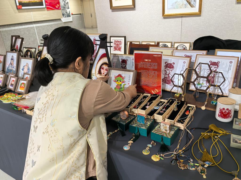 4月17日,在内蒙古牧勒社会工作服务中心就业的姚静整理摊位上的非遗文创产品。新华社记者魏冠宇 摄